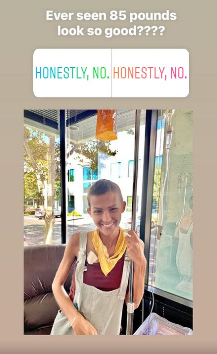 In a recent photo, she was seen smiling and holding on to an IV pole, while captioning the Instagram post: “Ever seen 85 pounds look so good????”