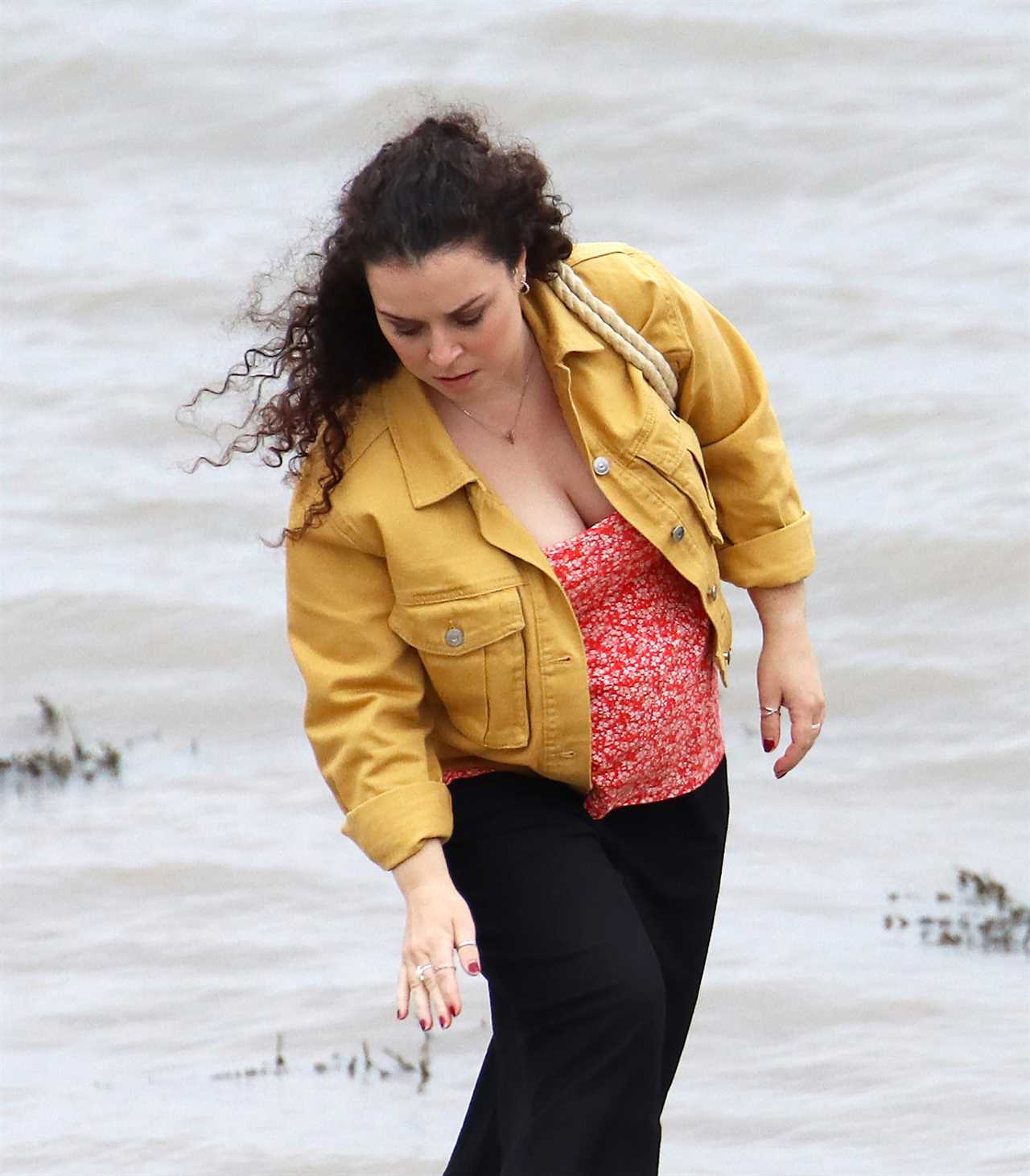 She wore her curly long brunette locks down and left her hair to tousle in the wind behind her.