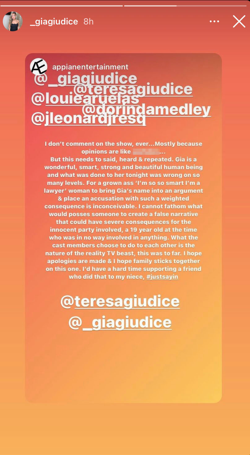 “Gia is a wondeful, smart, strong, and beautiful human being and what was done to her tonight was wrong on so many levels. As a grown a** ‘I’m so so smart I’m a lawyer’ woman to bring Gia’s name into an argument and place an accusation with such a weighted consequence is inconcievable.