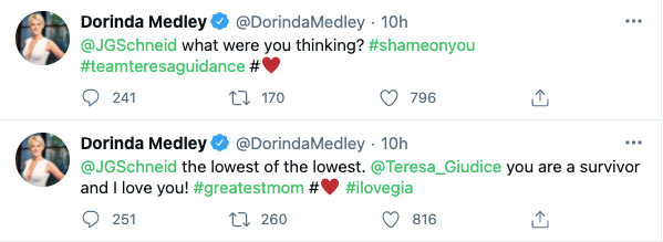 Former RHONY star Dorinda Medley also spoke out when she watched the episode and wrote: “Jackie, the lowest of the lowest. Teresa, you are a survivor and I love you!”