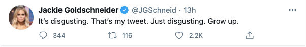 Following the episode, Jackie tried to explain herself and shared on Twitter: “It’s disgusting. That’s my tweet. Just disgusting. Grow up.”