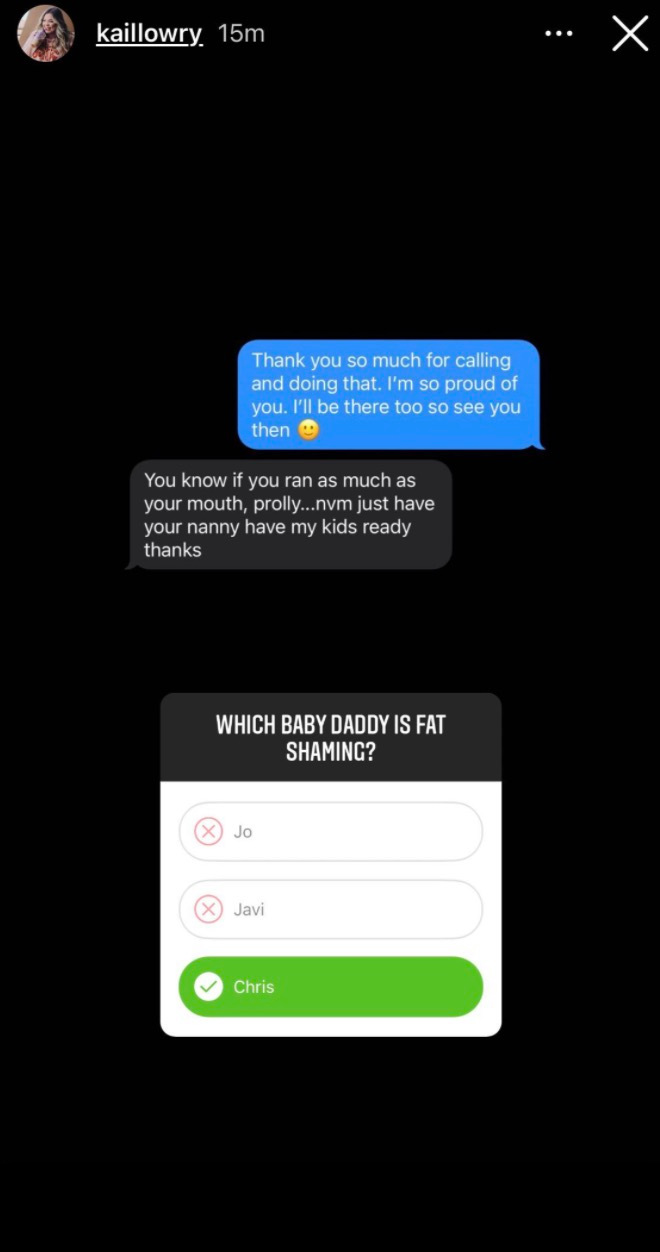 The TV personality then added a poll for her followers to guess which of her baby daddies sent the text, while Chris appeared as the correct answer.